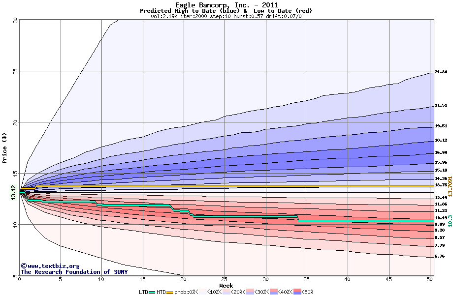 The high to date and low to date prices of the stock plotted against a random walk model for 2011 (what's this?).