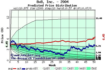 The high to date and low to date prices of the stock plotted against a random walk model for 2004 (what's this?).