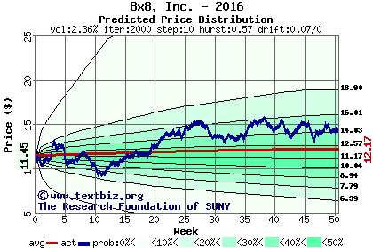The high to date and low to date prices of the stock plotted against a random walk model for 2016 (what's this?).