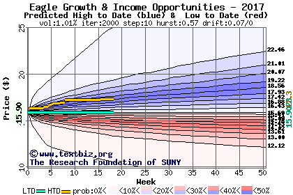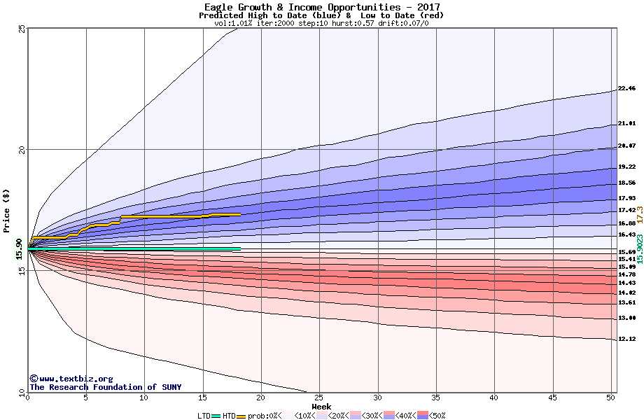 The high to date and low to date prices of the stock plotted against a random walk model for 2017 (what's this?).