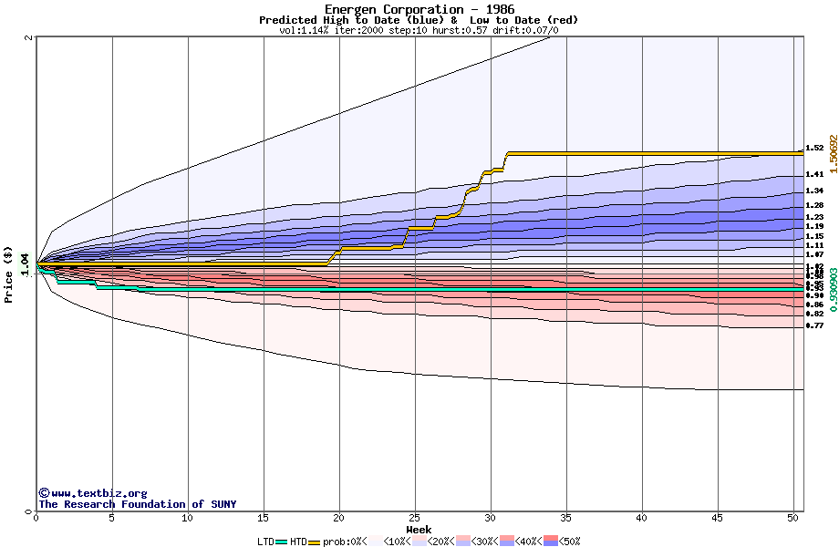 The high to date and low to date prices of the stock plotted against a random walk model for 1986 (what's this?).