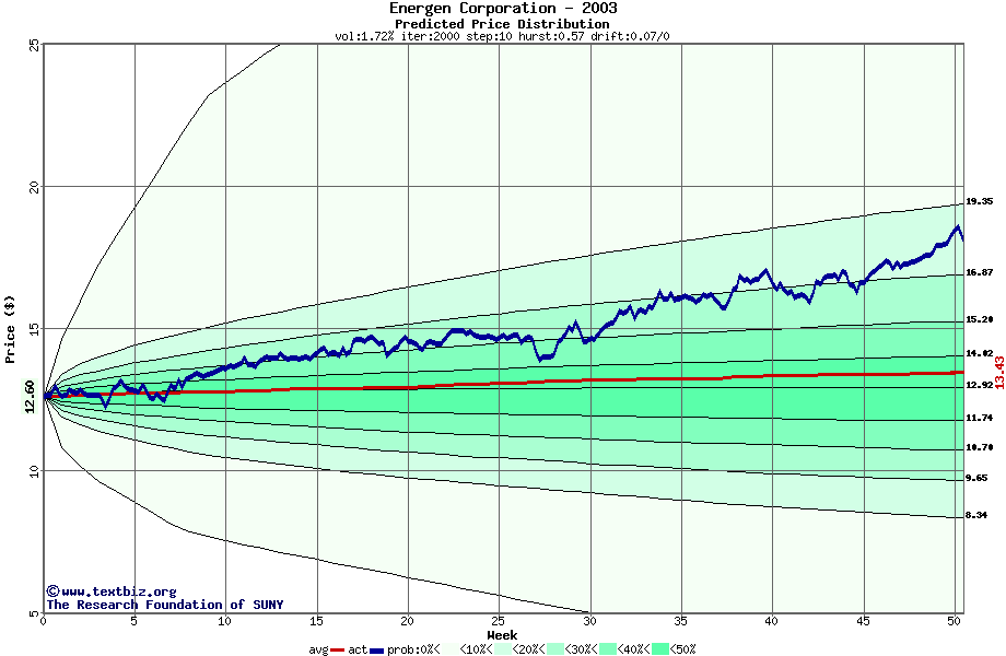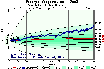 The following graph plots the year-to-date performance of the stock for 2003 compared to the probability calculated by a random walk model.