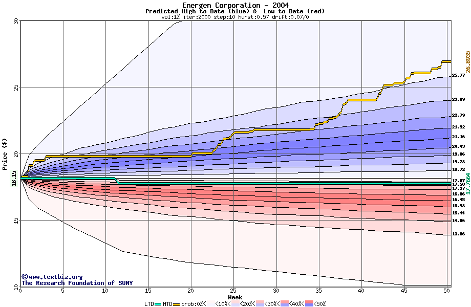 The high to date and low to date prices of the stock plotted against a random walk model for 2004 (what's this?).