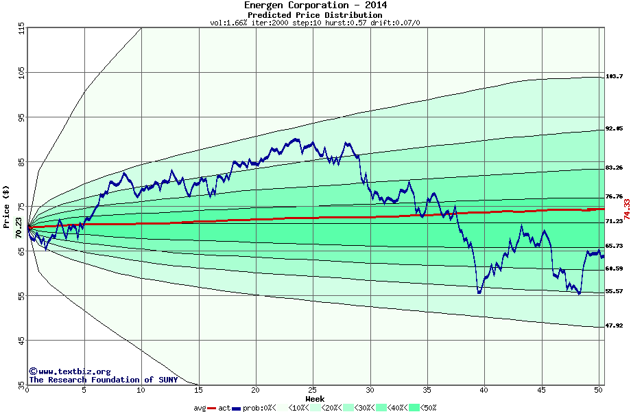 The following graph plots the year-to-date performance of the stock for 2014 compared to the probability calculated by a random walk model.