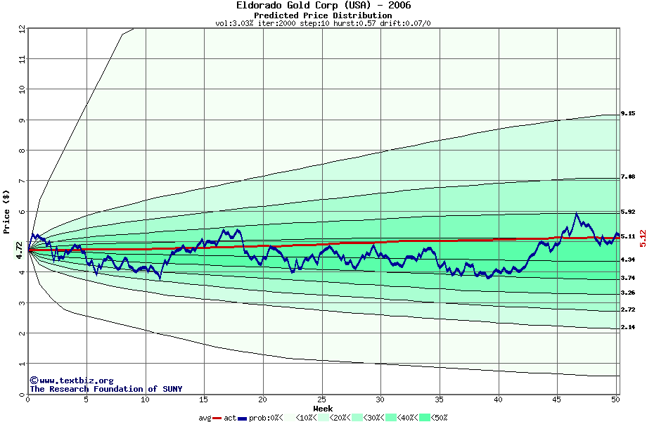 The high to date and low to date prices of the stock plotted against a random walk model for 2006 (what's this?).