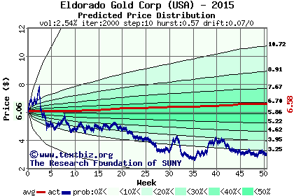The high to date and low to date prices of the stock plotted against a random walk model for 2015 (what's this?).