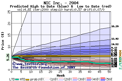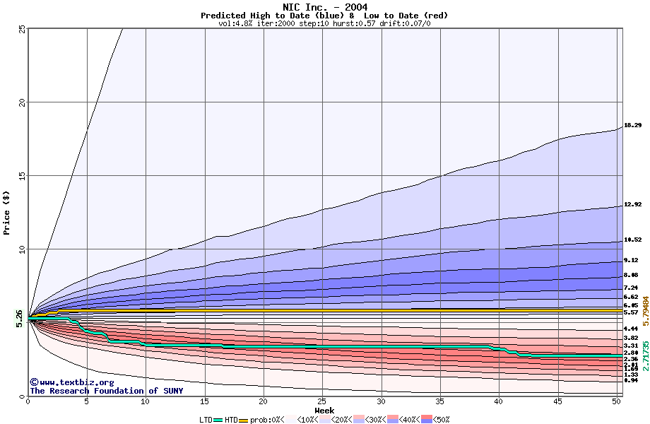 The high to date and low to date prices of the stock plotted against a random walk model for 2004 (what's this?).