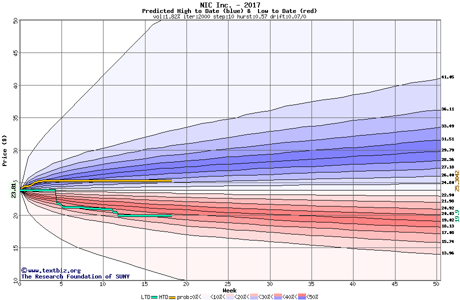 The high to date and low to date prices of the stock plotted against a random walk model for 2017 (what's this?).
