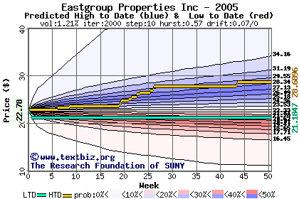 The following graph plots the year-to-date performance of the stock for 2005 compared to the probability calculated by a random walk model.