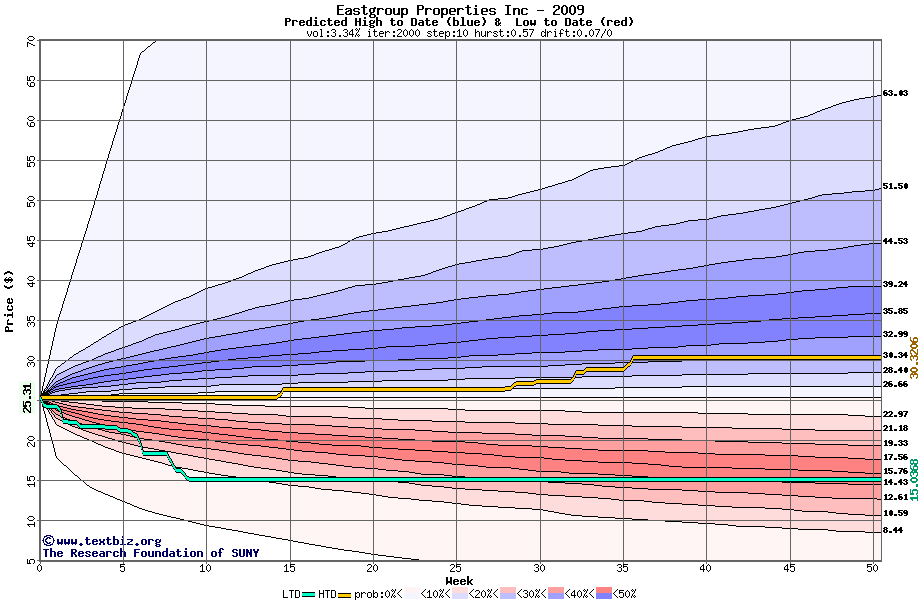 The high to date and low to date prices of the stock plotted against a random walk model for 2009 (what's this?).