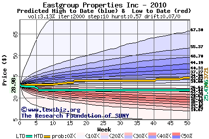 The high to date and low to date prices of the stock plotted against a random walk model for 2010 (what's this?).