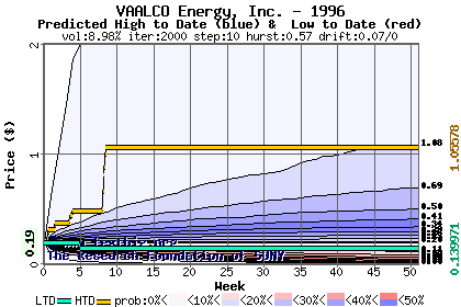 The high to date and low to date prices of the stock plotted against a random walk model for 1996 (what's this?).