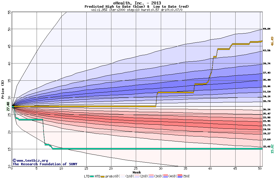 The high to date and low to date prices of the stock plotted against a random walk model for 2013 (what's this?).