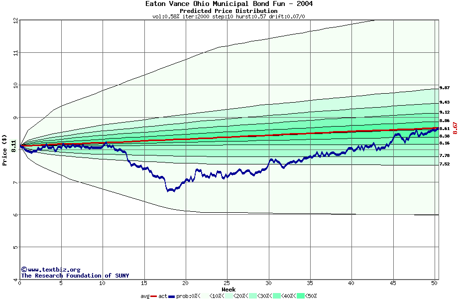 The high to date and low to date prices of the stock plotted against a random walk model for 2004 (what's this?).