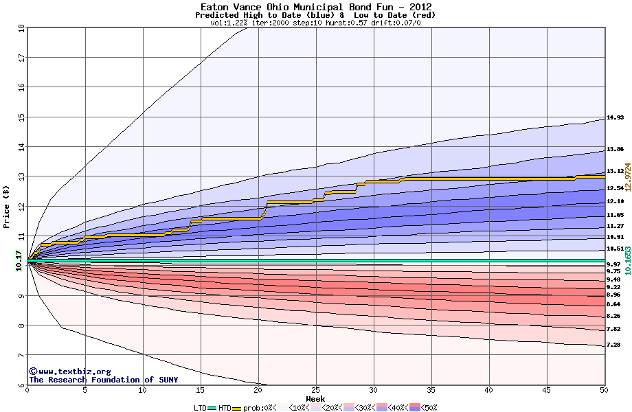 The high to date and low to date prices of the stock plotted against a random walk model for 2012 (what's this?).