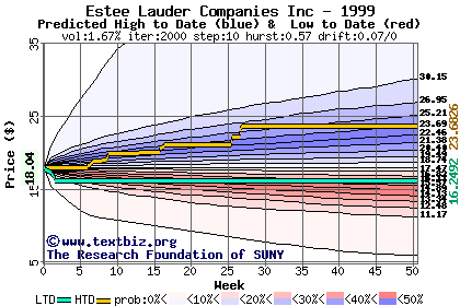 The high to date and low to date prices of the stock plotted against a random walk model for 1999 (what's this?).