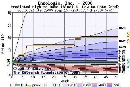 The high to date and low to date prices of the stock plotted against a random walk model for 2000 (what's this?).