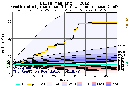 The high to date and low to date prices of the stock plotted against a random walk model for 2012 (what's this?).