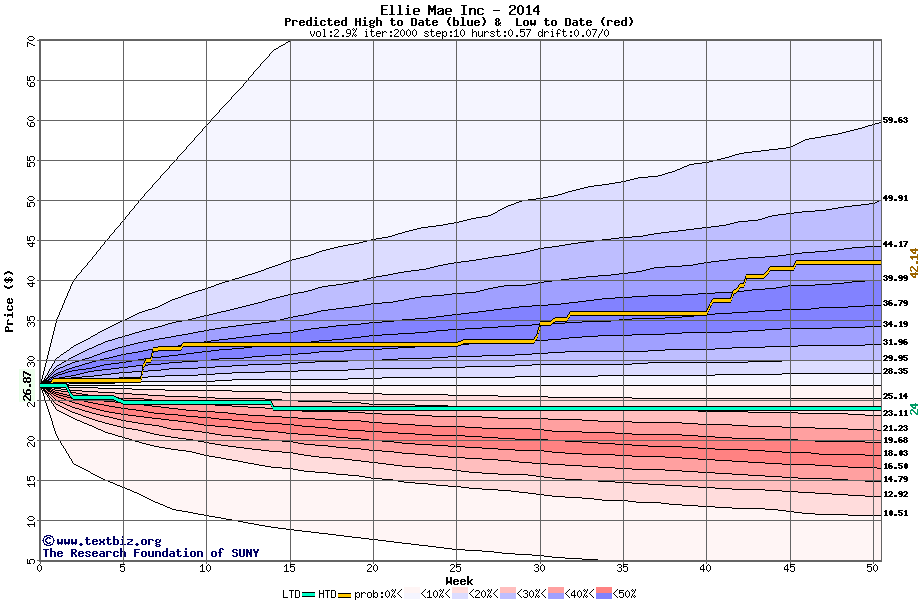 The high to date and low to date prices of the stock plotted against a random walk model for 2014 (what's this?).