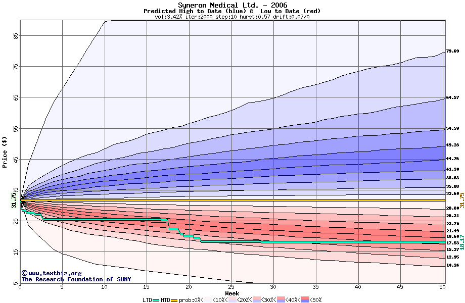 The high to date and low to date prices of the stock plotted against a random walk model for 2006 (what's this?).