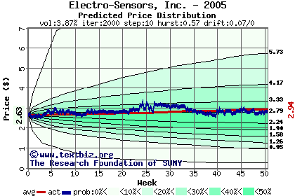 The following graph plots the year-to-date performance of the stock for 2005 compared to the probability calculated by a random walk model.