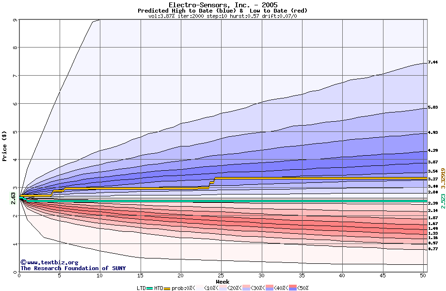 The high to date and low to date prices of the stock plotted against a random walk model for 2005 (what's this?).