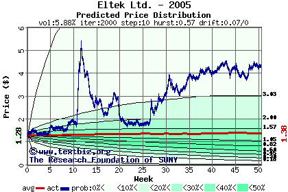 The high to date and low to date prices of the stock plotted against a random walk model for 2005 (what's this?).