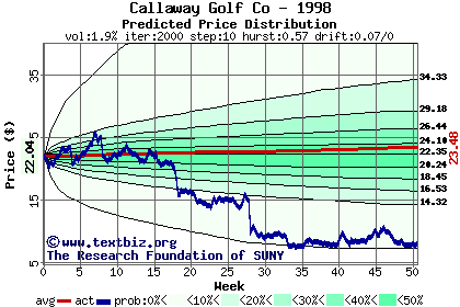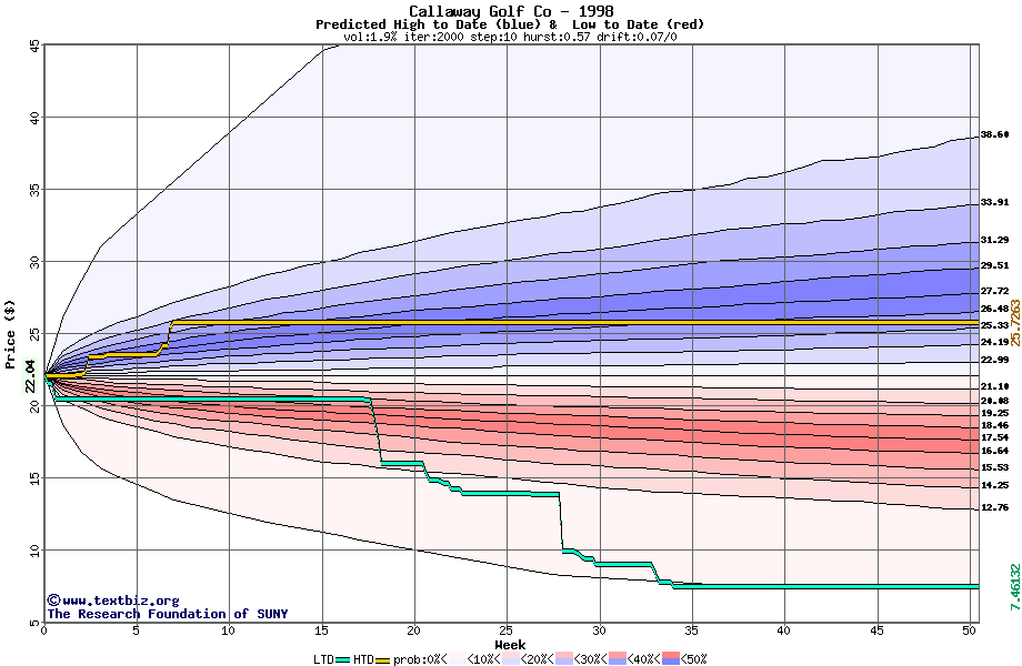 The following graph plots the year-to-date performance of the stock for 1998 compared to the probability calculated by a random walk model.