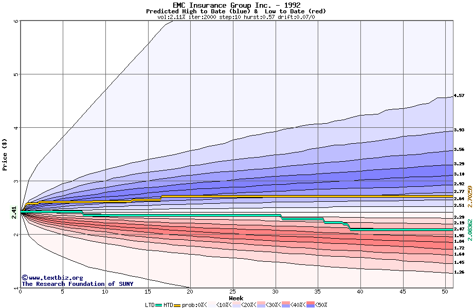 The high to date and low to date prices of the stock plotted against a random walk model for 1992 (what's this?).