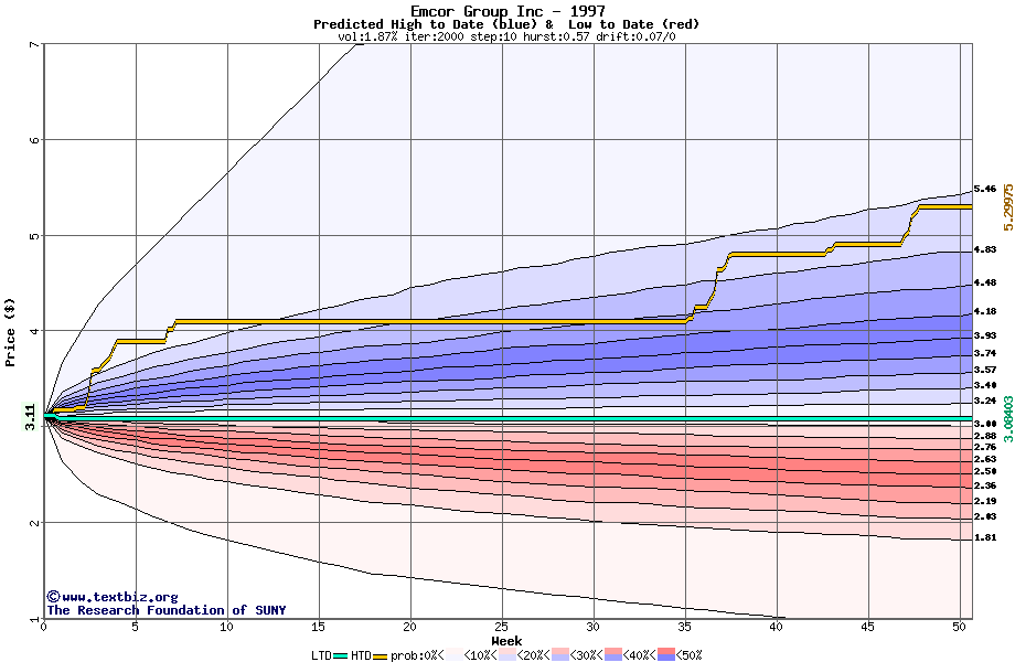 The high to date and low to date prices of the stock plotted against a random walk model for 1997 (what's this?).