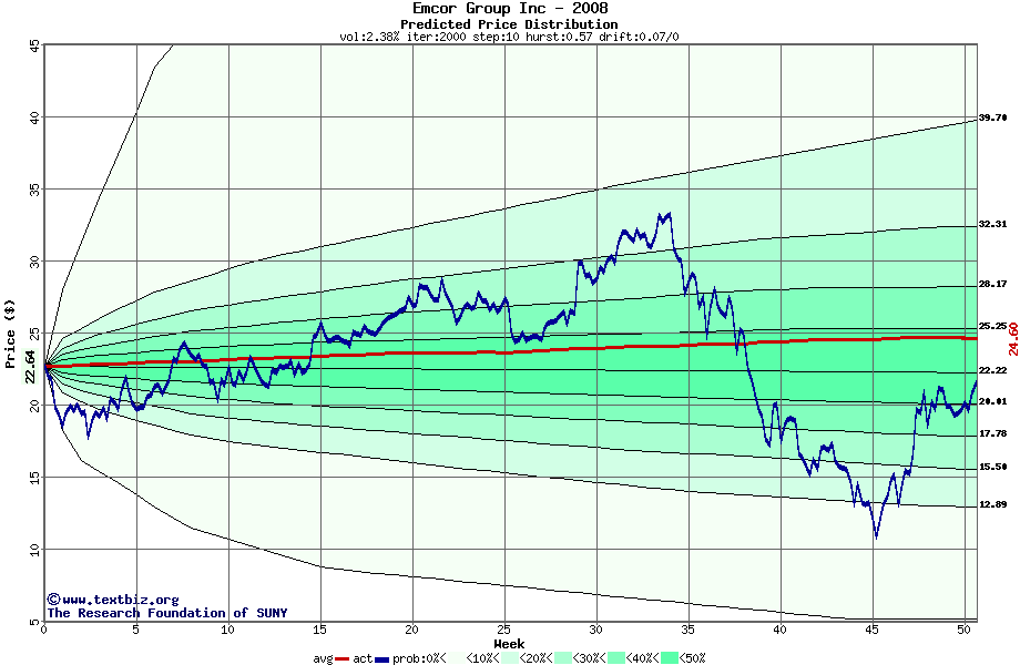 The following graph plots the year-to-date performance of the stock for 2008 compared to the probability calculated by a random walk model.
