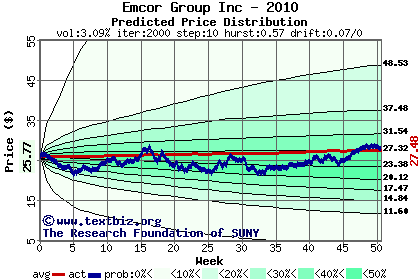 The high to date and low to date prices of the stock plotted against a random walk model for 2010 (what's this?).