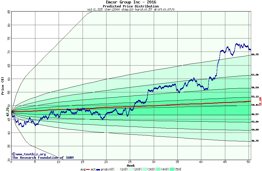 The following graph plots the year-to-date performance of the stock for 2016 compared to the probability calculated by a random walk model.