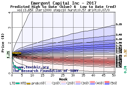 The high to date and low to date prices of the stock plotted against a random walk model for 2017 (what's this?).