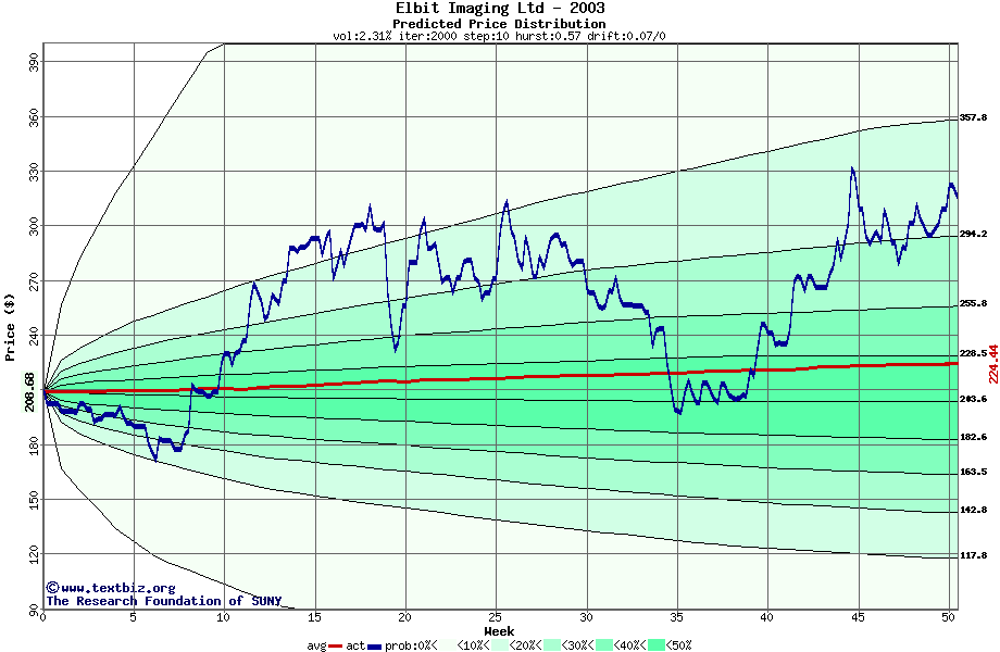 The following graph plots the year-to-date performance of the stock for 2003 compared to the probability calculated by a random walk model.