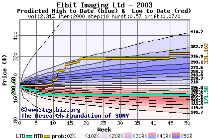 The high to date and low to date prices of the stock plotted against a random walk model for 2003 (what's this?).