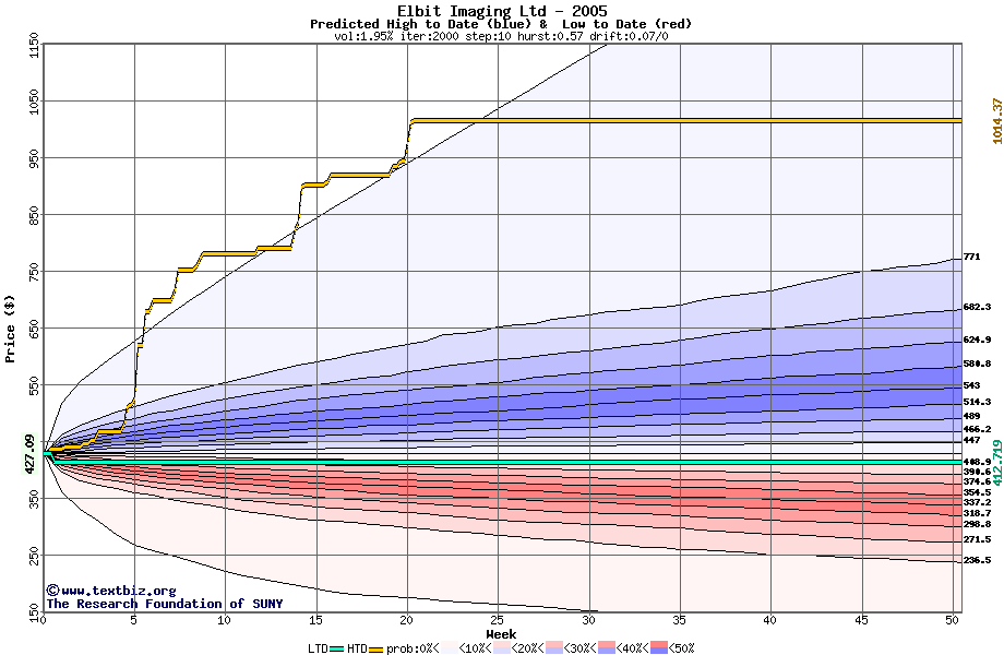 The high to date and low to date prices of the stock plotted against a random walk model for 2005 (what's this?).