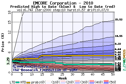 The high to date and low to date prices of the stock plotted against a random walk model for 2010 (what's this?).