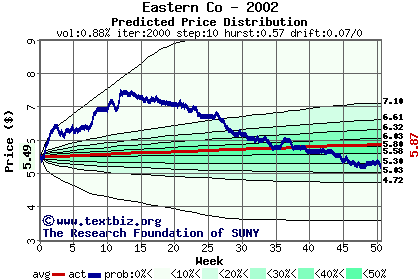 The high to date and low to date prices of the stock plotted against a random walk model for 2002 (what's this?).