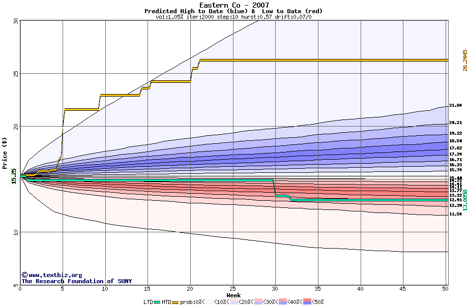 The high to date and low to date prices of the stock plotted against a random walk model for 2007 (what's this?).