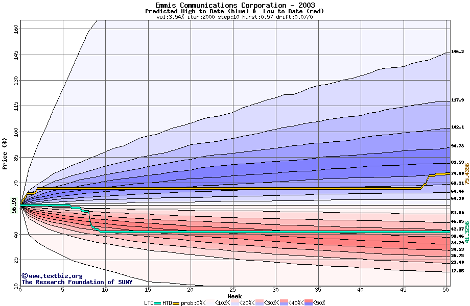 The high to date and low to date prices of the stock plotted against a random walk model for 2003 (what's this?).