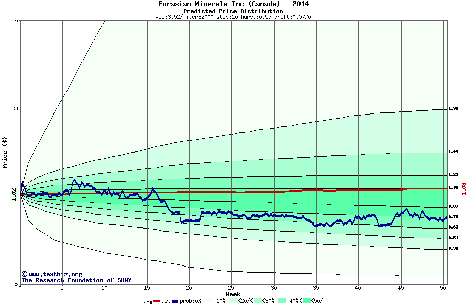 The high to date and low to date prices of the stock plotted against a random walk model for 2014 (what's this?).