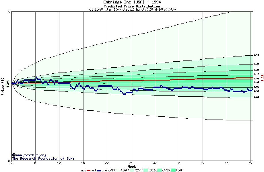 The following graph plots the year-to-date performance of the stock for 1994 compared to the probability calculated by a random walk model.