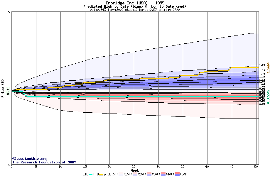 The high to date and low to date prices of the stock plotted against a random walk model for 1995 (what's this?).