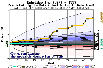 The high to date and low to date prices of the stock plotted against a random walk model for 1997 (what's this?).