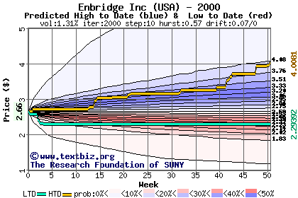 The high to date and low to date prices of the stock plotted against a random walk model for 2000 (what's this?).
