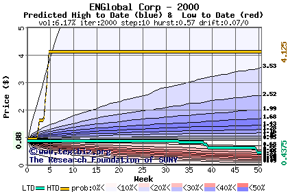 The high to date and low to date prices of the stock plotted against a random walk model for 2000 (what's this?).