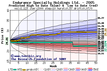 The high to date and low to date prices of the stock plotted against a random walk model for 2005 (what's this?).