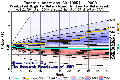The high to date and low to date prices of the stock plotted against a random walk model for 2003 (what's this?).