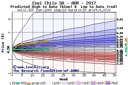 The high to date and low to date prices of the stock plotted against a random walk model for 2017 (what's this?).